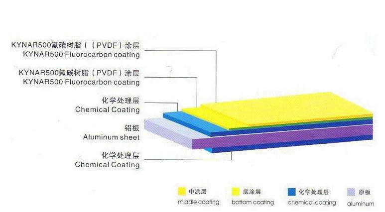 铝单板是指经过铬化等处理后,再采用氟碳喷涂技术,加工形成的建筑装饰材料。氟碳涂料主要是指聚偏氟乙烯树脂(KANAR500),分底漆、面漆、清漆三种。