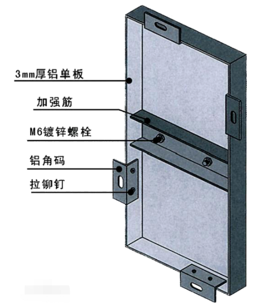 普通铝单板其构造主要由面板、加强筋和角码组成。表面一般经过铬化等处理后,在采用氟碳或粉末喷涂处理。